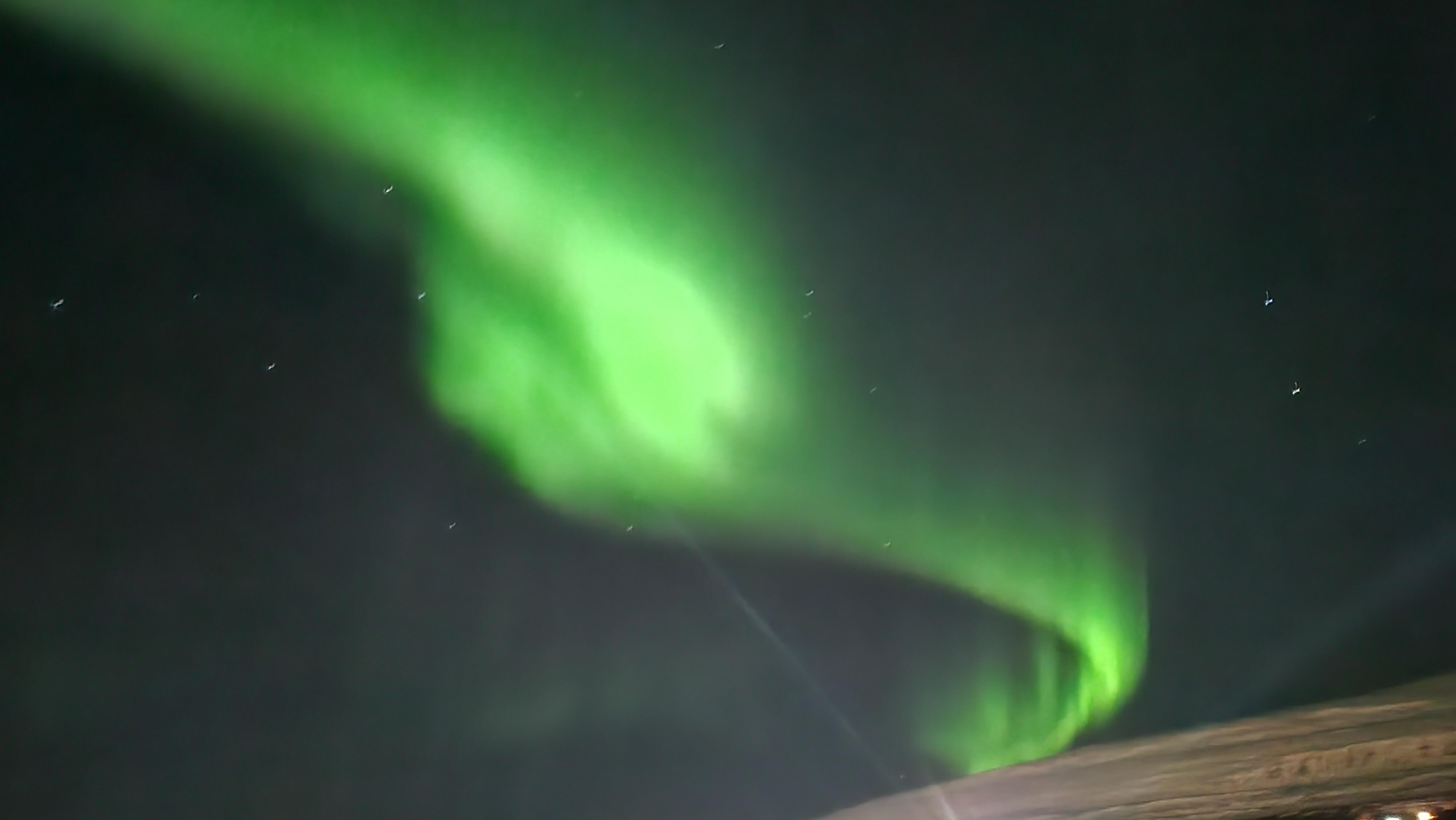 첫날밤에는 시차 적응 때문에 오로라를 보지 못했습니다. 두 번째 날 밤부터 숙소 근처에서 약한 오로라를 봤습니다. 하늘에 연두색 빛이 흐릿하게 퍼져 있었는데, 육안으로는 희미했지만 스마트폰 카메라로 찍으니 더 선명하게 나왔습니다. 사진을 찍자마자 투어팀 단톡방에 사진을 올렸더니 사람들이 밖에 나와서 흥분하며 사진을 찍었고, 저도 처음 보는 오로라에 감동했습니다. 이후 일정은 더 시골 쪽으로 들어가는 일정이라 더 진하고 멋있는 오로라를 볼 수 있었습니다. 다들 처음에는 오로라가 신기해서 사진도 열심히 찍고 하더니 오로라를 몇 번 더 보니까 익숙해졌는지 처음보다는 사진을 찍거나 오로라가 떴다고 좋아하는 반응이 줄어들어 재미있었습니다.